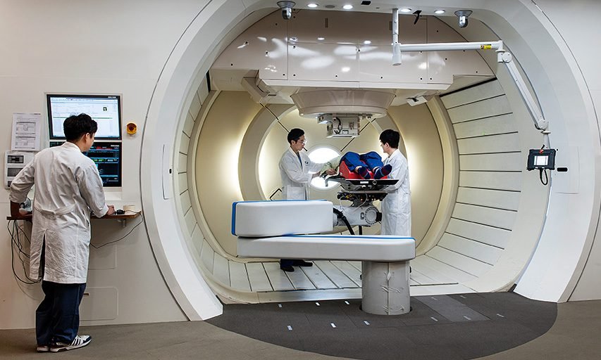 The Samsung Proton Therapy Center at the Samsung Medical Center has introduced the next-generation proton therapy device which is equipped with abilities to perform Wobbling and Line Scanning. The wobbling method is used to treat large treatment sites in which the movements of organs are influenced by respiration. The Line Scanning method is appropriate for treatments that need precise treatments due to closely positioned normal organs near the cancer tissues. Moreover, advanced treatment equipment such as the Cone Beam CT (CBCT) and Robotic Couch will provide accurate and comfortable treatments to patients.